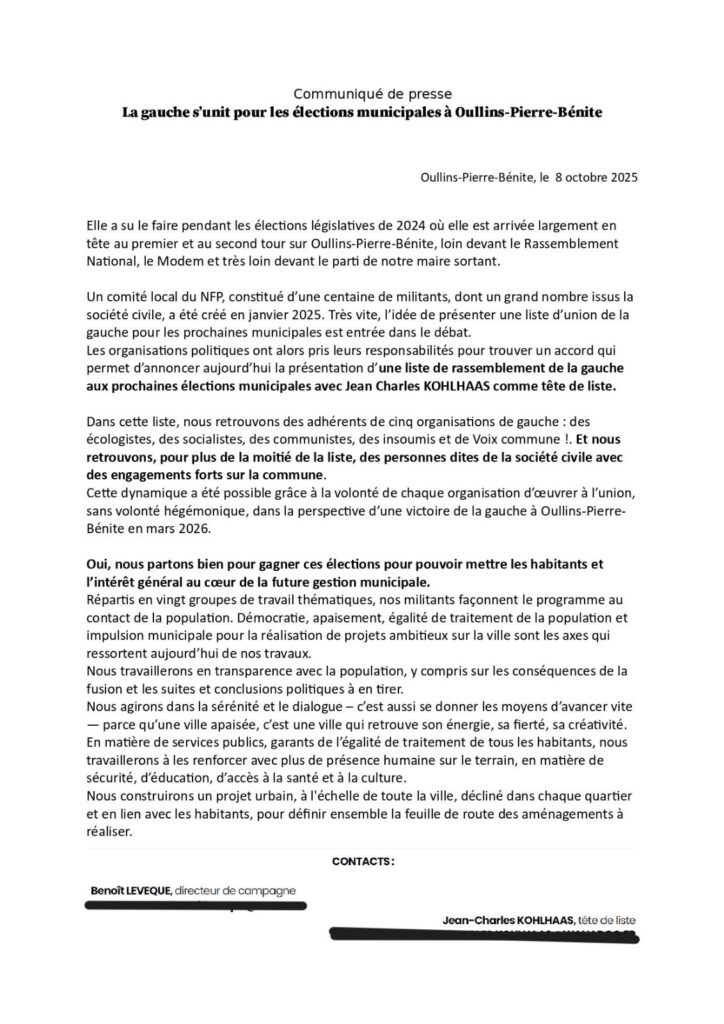 Voici le communiqué de presse qui lance officiellement la liste de rassemblement de la gauche pour les élections municipales de 2026 avec Jean-Charles KOHLHAAS du Temps d’Agir en tête de liste!